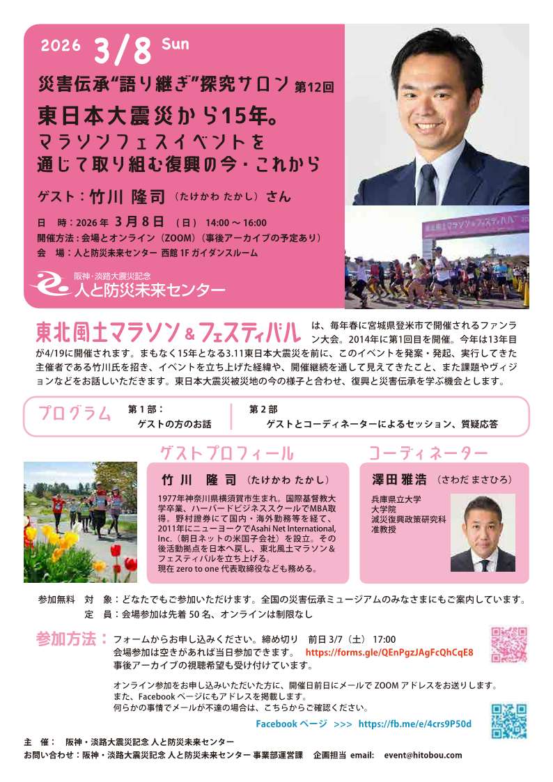 人と防災未来センターでは、現在、西館1階ロビーで開催中の企画展「「3.11東日本大震災から15年。垣間見る、被災・復興地の現在進行形 ~feat.東北風土マラソン2026」関連イベントとして、令和8年3月8日(日)に、災害伝承語り継ぎ探究サロン(第12回)「東日本大震災から15年。マラソンフェスイベントを通じて取り組む復興の今・これから」を開催します。