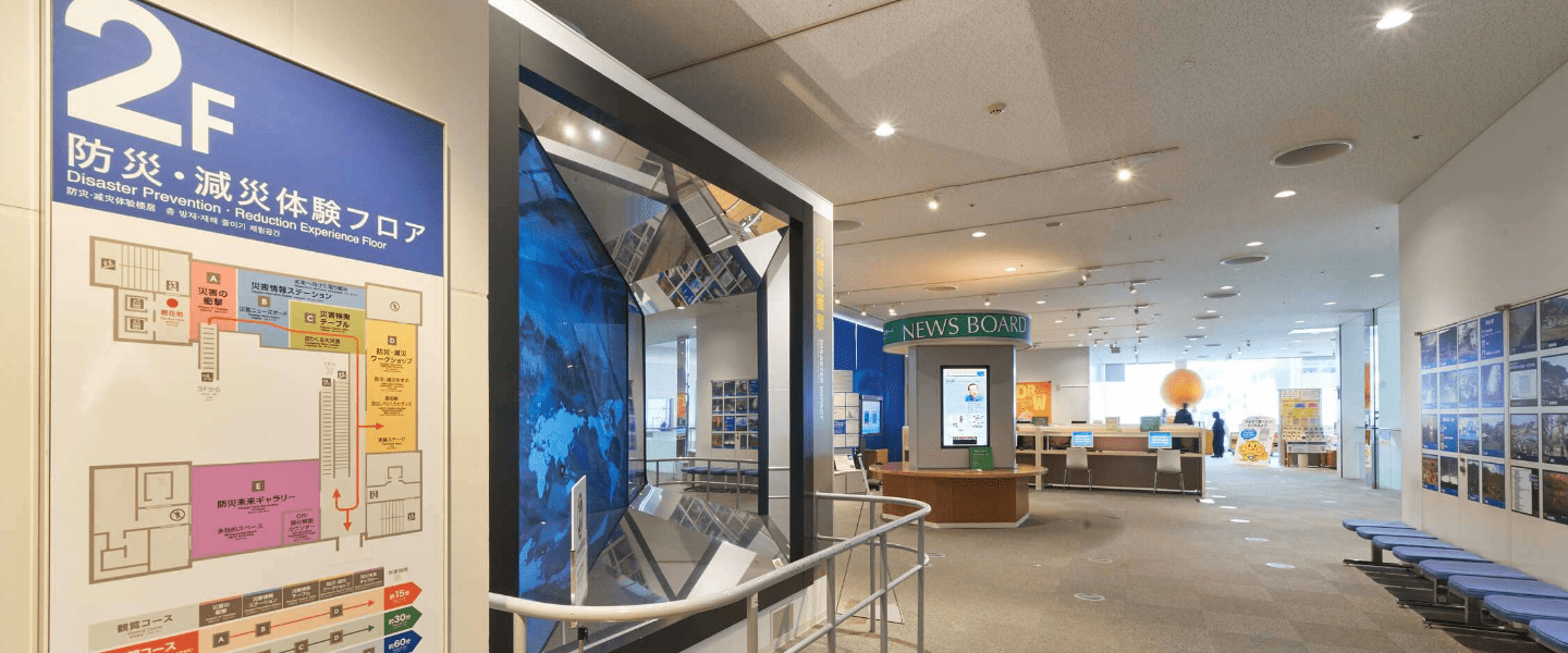 世界各地の自然災害を検索できるテーブル、楽しみながら災害や防災について知ることのできるパズルなどの体験型実験装置ワゴンなどがあります。また、災害に備える用品類を実物展示で紹介するコーナーがあります。
