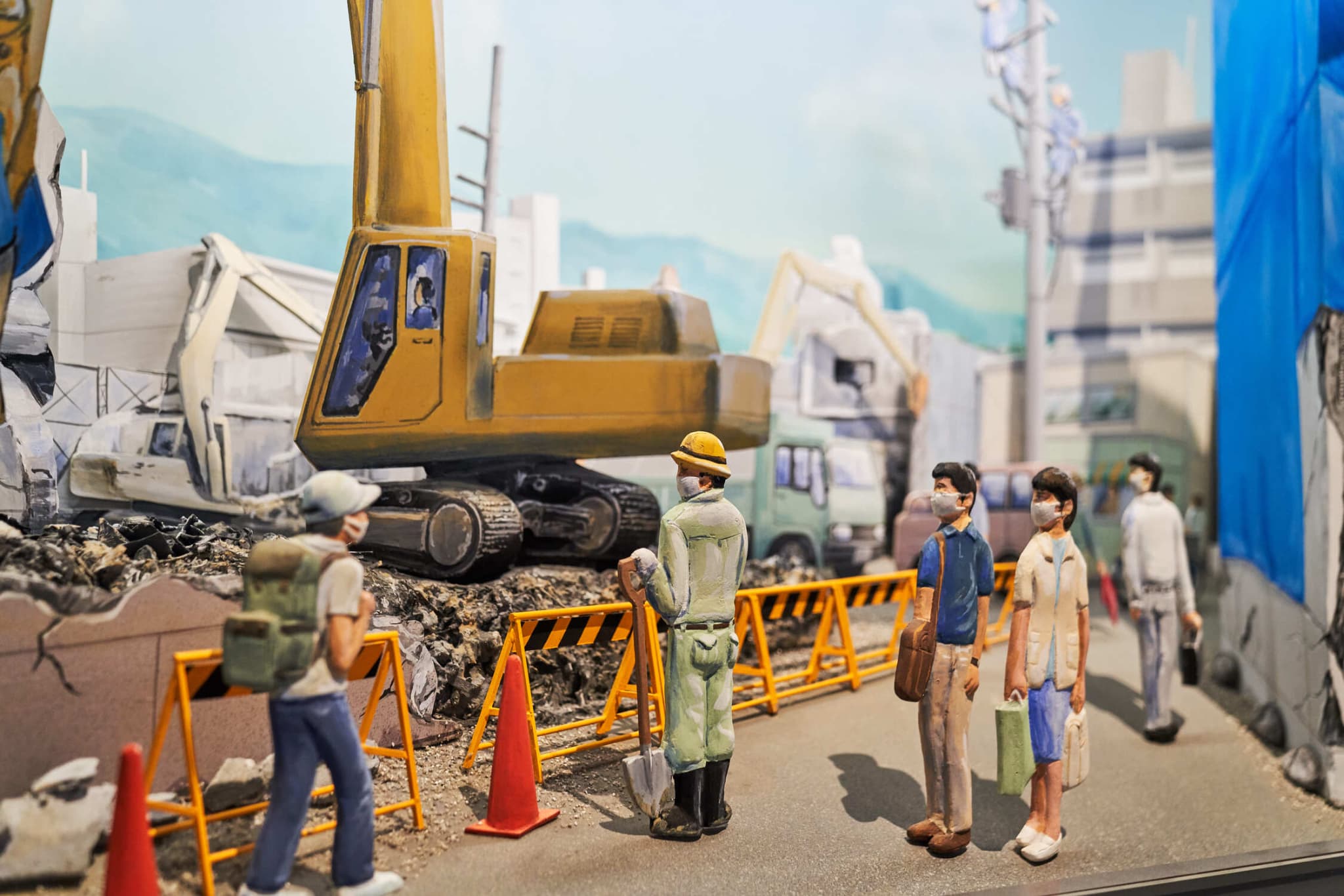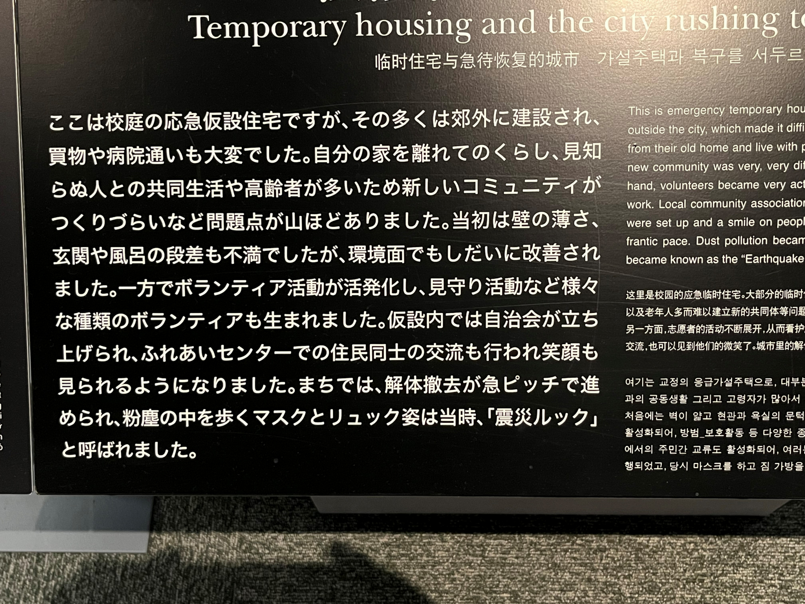 3~6か月後 再建への第一歩 「それぞれの再建への動き」 「再建は、不安と苦難の連続でした」応急仮設住宅(48,300戸建設)の多くは郊外に建設され、買い物・通院が大変でした。見知らぬ人々との共同生活で新しいコミュニティがつくりづらいなど問題が山ほどありました。 応急仮設住宅での新たな生活復興を急ぐまち