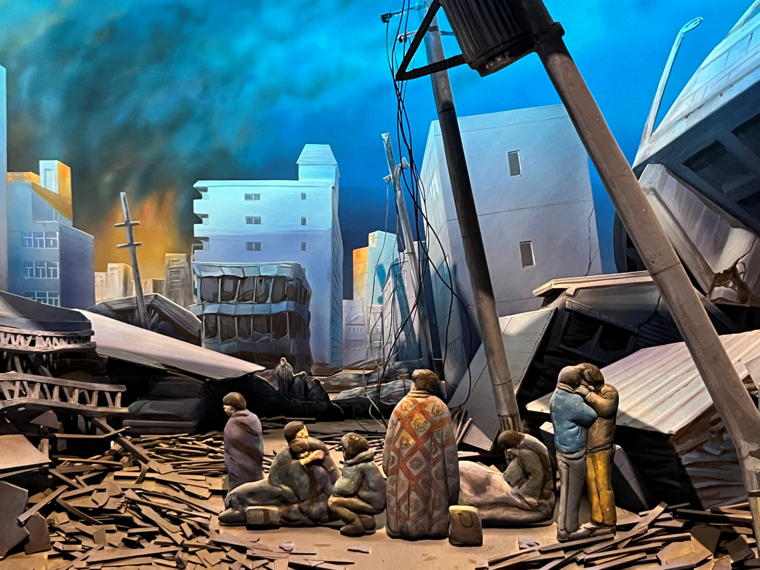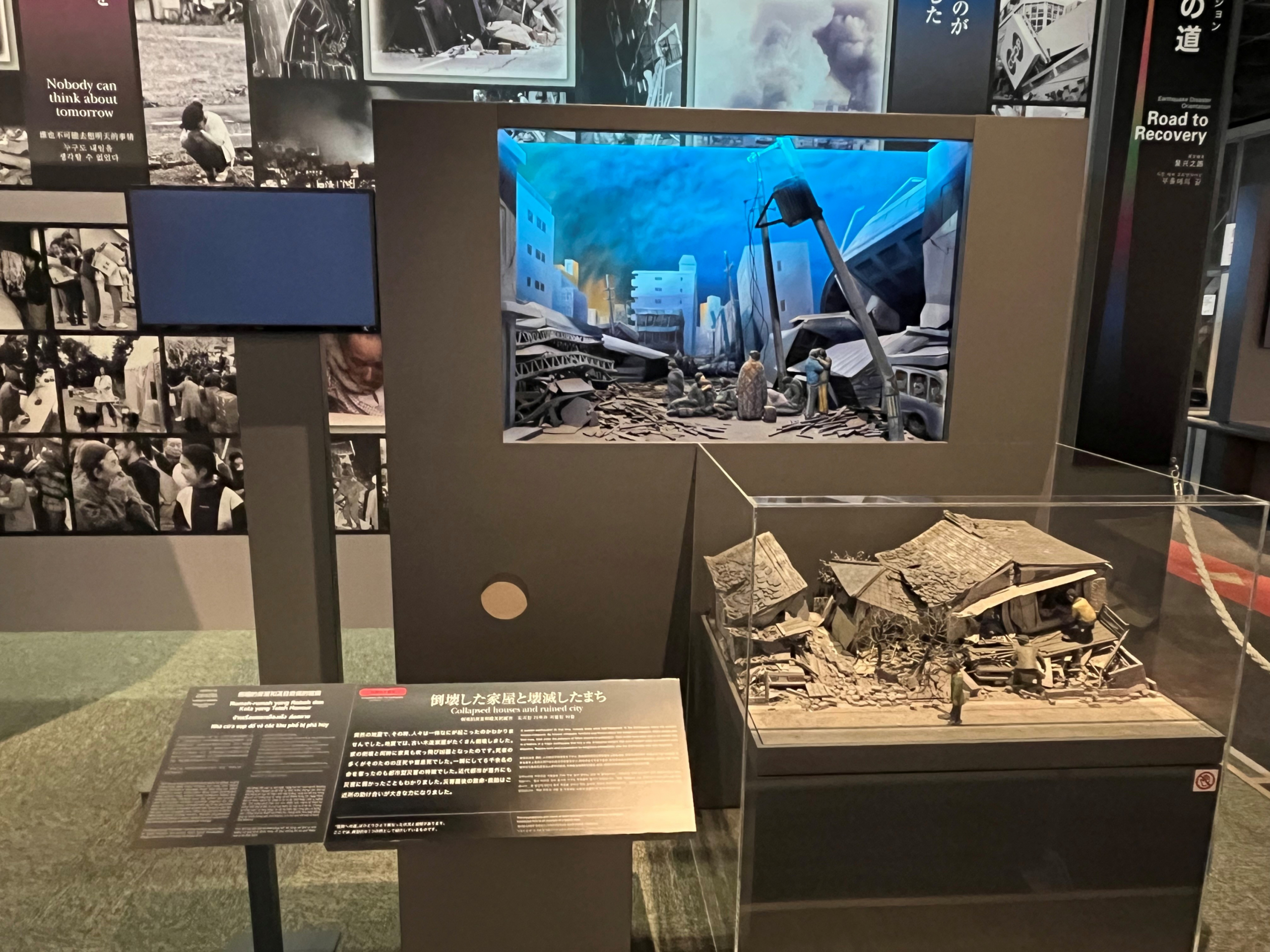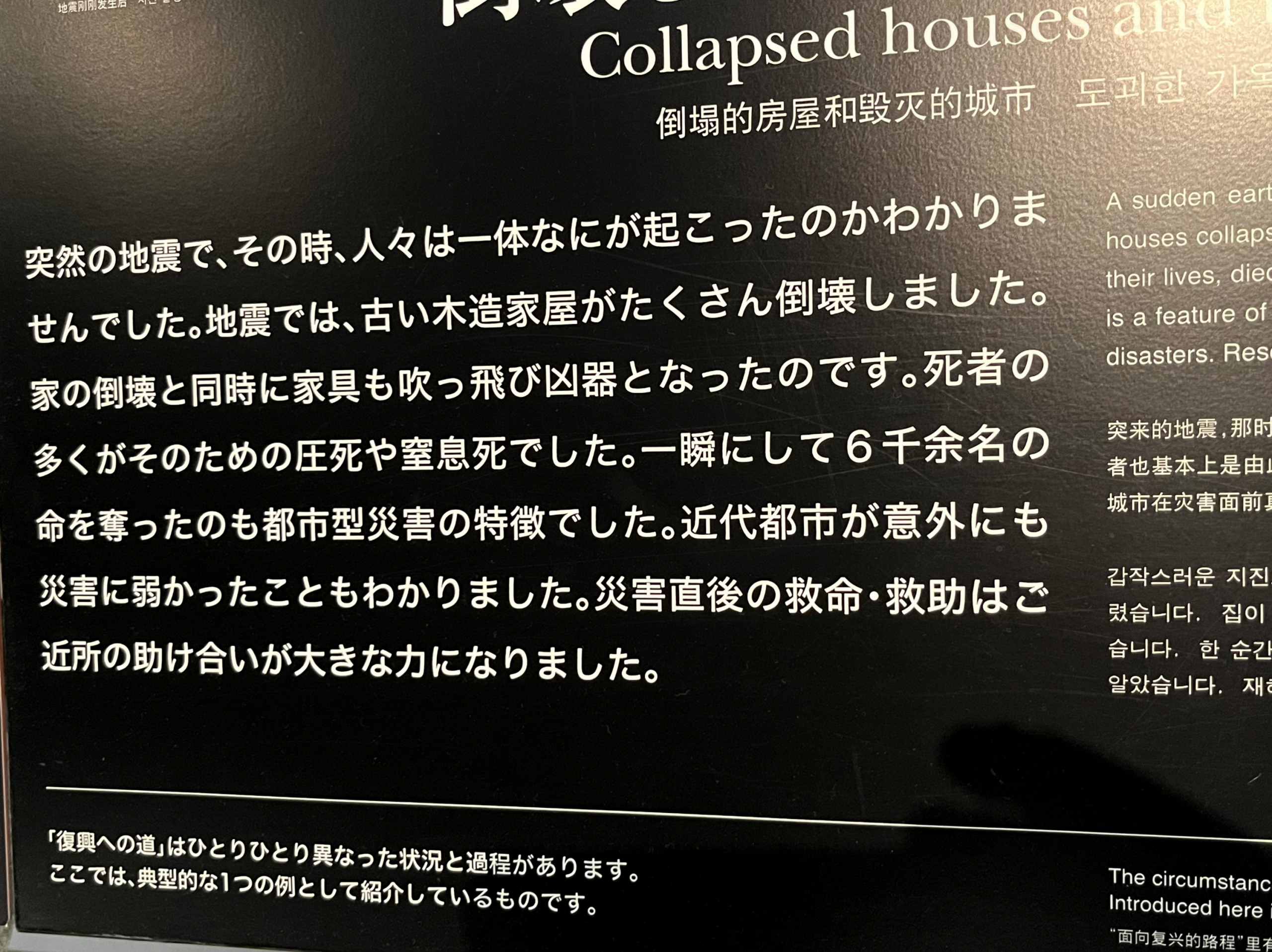 震災直後 つぶれた家の中から見た被災地 「生と死のあいだで」 「生きているのが不思議でした」大震災では、古い木造住宅がたくさん倒壊しました。死者の多くが圧死や窒息死でした。災害直後の救命・救急は近所の助け合いが大きな力になりました。 破壊したまち倒壊した家屋