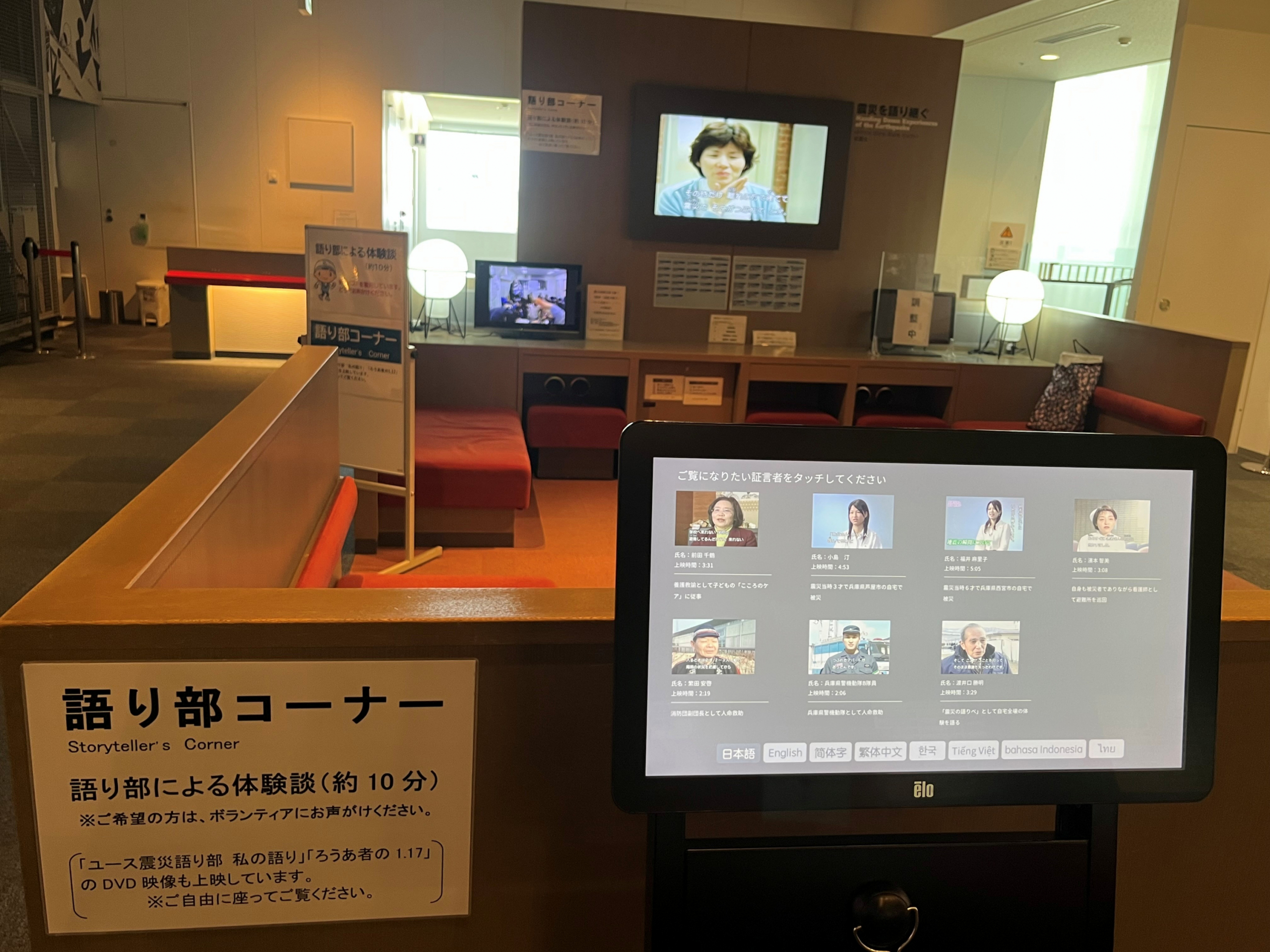 震災を語り継ぐコーナーでは、震災の体験を、被災者、医療関係者、消防団員、県警機動隊員等25名と、震災当時、児童や学生だったユース震災語り部27名、計52名が語るビデオ(1人5分程度)を、モニターにて上映しています。